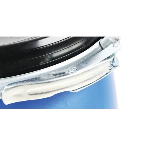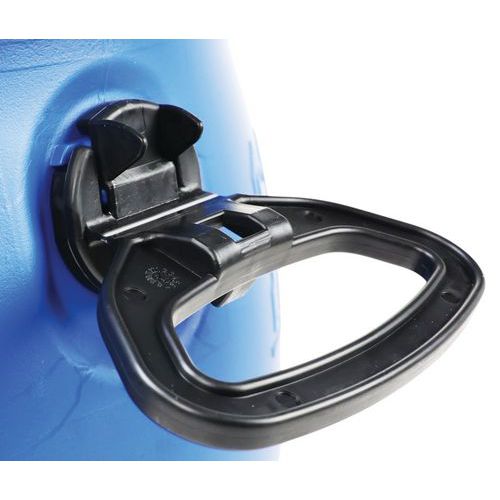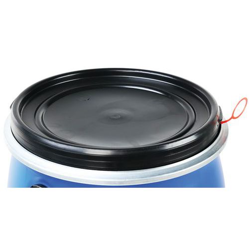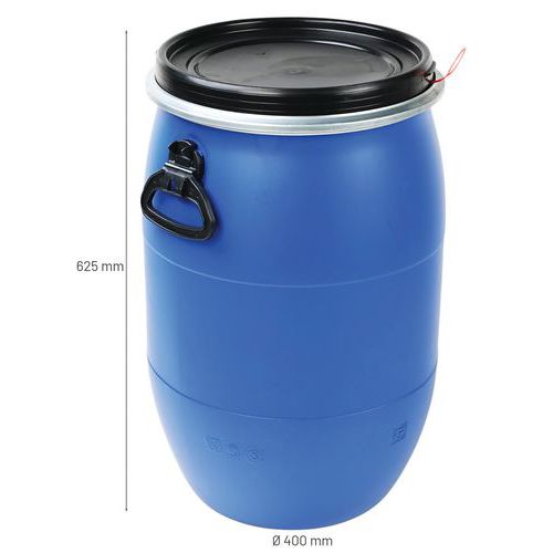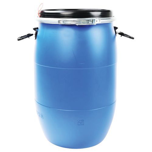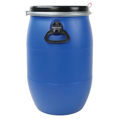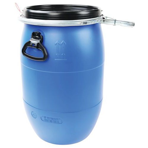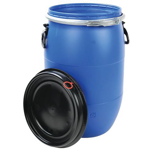 Cylindrisk tønde i HDPE til sikker opbevaring og transport. Leddet låg med galvaniseret stålring med pakning og håndtag. FN-godkendt til transport af farlige materialer. Nem håndtering af modeller på 30 l og 60 l: bærehåndtag.