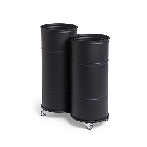 - Tønde i mat pulverlakeret stålplade med hjulbase for nem flytning.