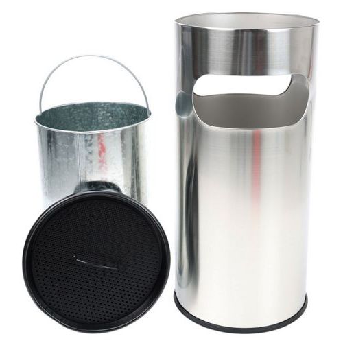 - Rund brandsikker affaldsbeholder med askebæger i rustfrit stål med metalforing.