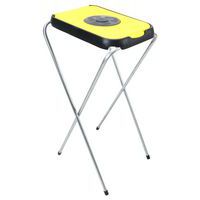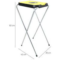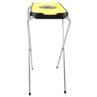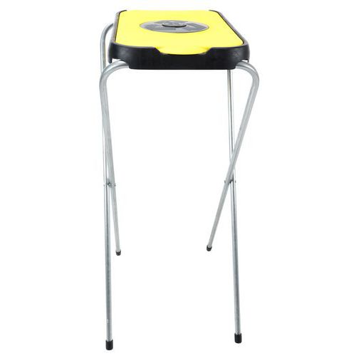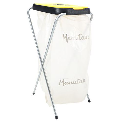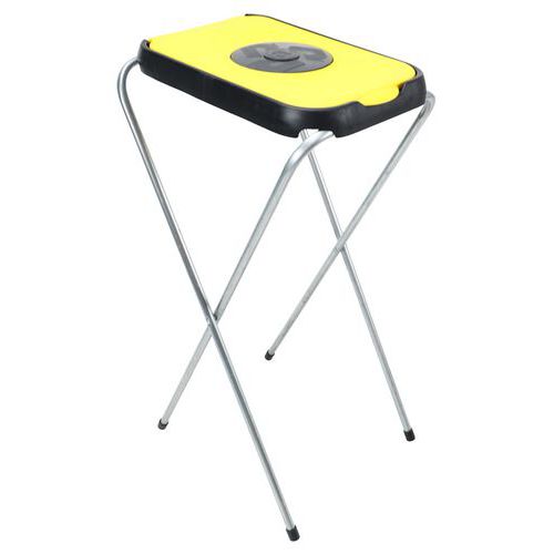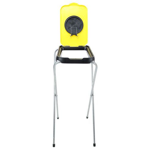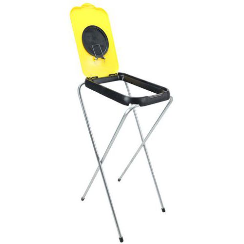 Et enkelt, sammenklappeligt affaldsposeholder/sækkestativ bestående af en galvaniseret rørkonstruktion og farvet plastlåg.