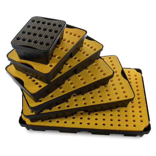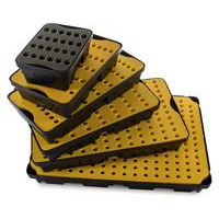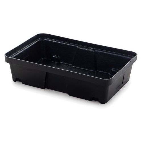 Mindre opsamlingskar til sikker opbevaring og håndtering af små beholdere. Kompatibel med de fleste kemikalier. Skridsikker platformoverflade giver sikker håndtering. Aftagelig platform med håndtag for nem løftning. Integrerede inspektionsåbninger gør det nemt at kontrollere væskeniveauet. Karret er nemt at rengøre takket være den aftagelige platform. Testet i henhold til DIBt-standarder (kun sort platform). Fremstillet i Storbritannien Maksimal statisk last (kg) : 50 kg