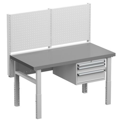 Vælg mellem forskellige konfigurationer: en model med to høje perforerede plader og LED-belysning, som kan skrues fast til gulvet for ekstra stabilitet, en anden med høj perforeret plade, perforeret værktøjsskab og en låsbar skuffesektion med seks skuffer, samt en model med to perforerede plader og en låsbar skuffesektion med tre skuffer.