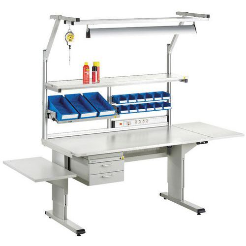 Treston WB arbejdsbord er særligt velegnet til elektronikindustrien og som værkstedsbænk. Bordpladen kan justeres trinløst, enten elektrisk eller med håndsving eller unbrakonøgle. Takket være moduler til placering over arbejdsbordet og en bred vifte af tilbehør og ekstra produkter er det nemt at skabe en yderst ergonomisk arbejdsplads. Arbejdsbordene i denne produktfamilie kan nemt placeres side om side, ryg mod ryg eller mod en væg i forskellige formationer. Trinløs højdejustering af bordplade 700–1100 mm Aluminiumsprofil med høj finish appellerer til øjet. Laminat bordplade. Velegnet til renrum med ISO klasse 7 Vi har også side- og hjørnemoduler til udvidelse Max belastning 300 kg Fås også med ESD-beskyttelse Kan nemt placeres ryg mod ryg, side om side eller i et hjørne.