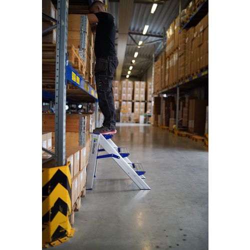 Arbejdstigen er let at tage med sig – den bliver flad, når den foldes sammen og kan nemt flyttes takket være et forudmonteret håndtag.