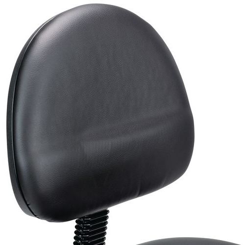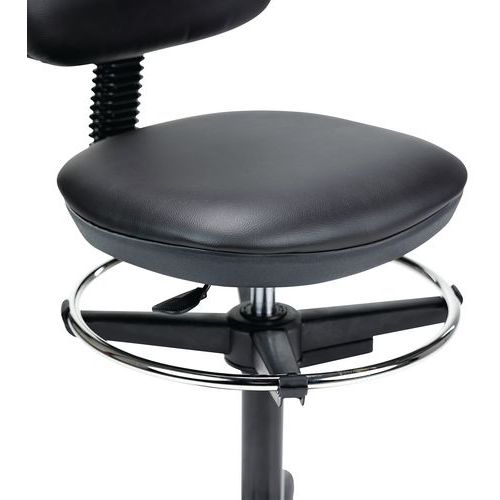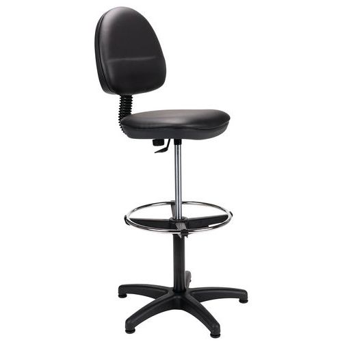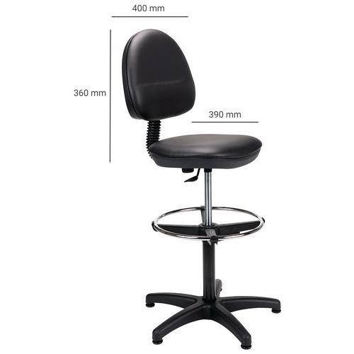 | Varenavn | Arbejdsstol høj, Armlæn: nej, Type af bund: 5 fod, Sæde, materiale: Vinyl, Ryglæn: ja, Sæde model: Høj |