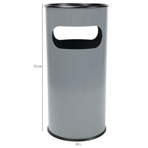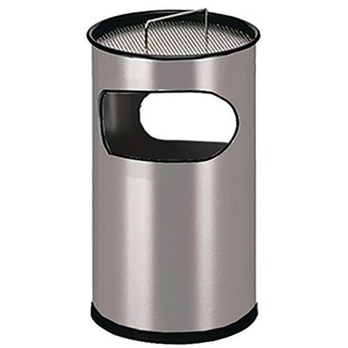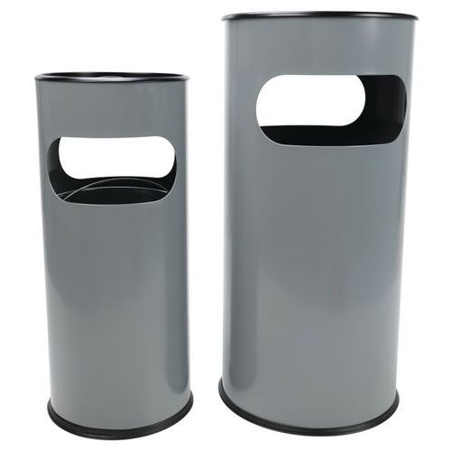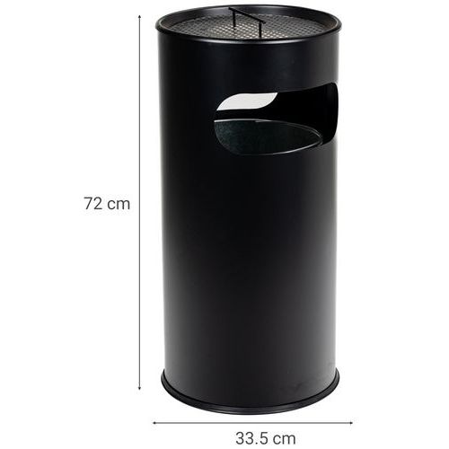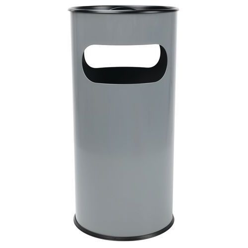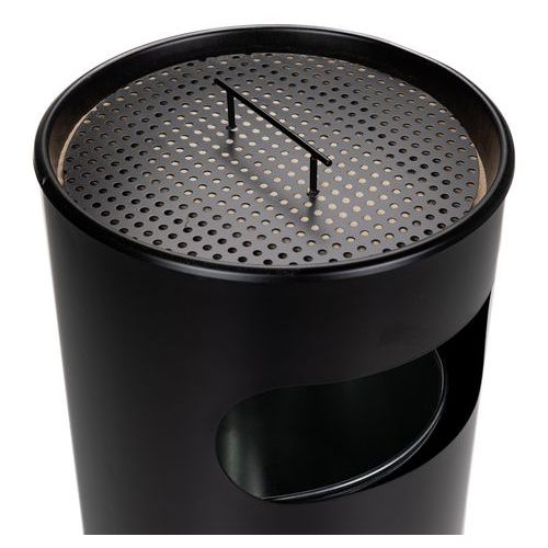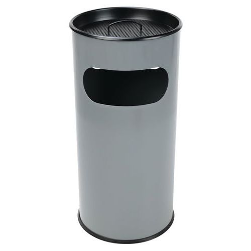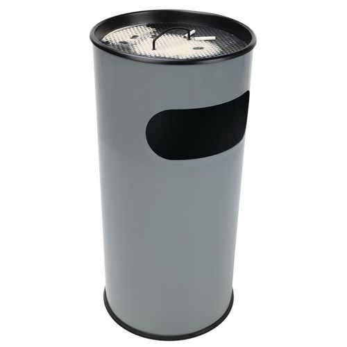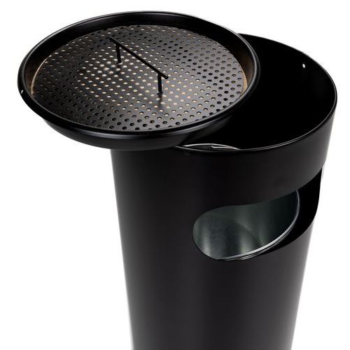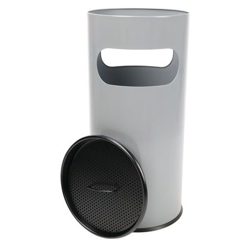Rundt, brandsikkert askebæger/skraldespand med metalforing..Med en trådnettop og et sort panel..Net til nem skodning af cigaretter..Håndtag på toppen for nem tømning af affaldsspanden..Alle Manutan-produkter er testet og godkendt af vores teams.
