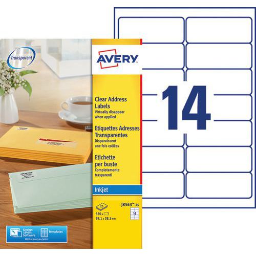 | Varenavn | Transparent adresseetiket, blækprinterudskrift, Antal etiketter/ark: 14, Antal etiketter: 350, Etiket |