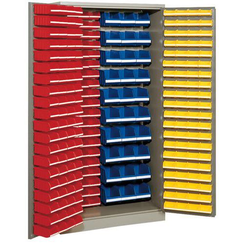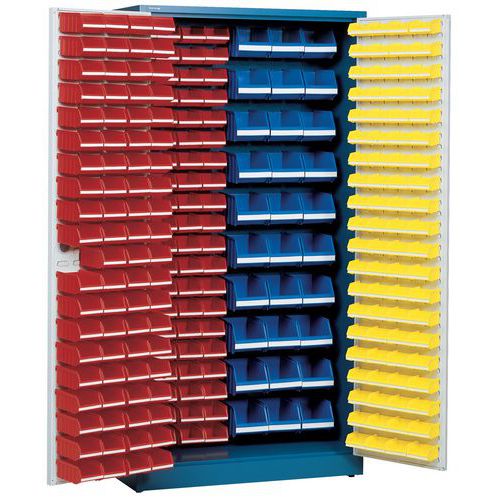 - Skab med 273 bakker. Plads til etiketter og tekst på samtlige bokse som visualiserer og forenkler opbevaringen af småting. Skab med døre med plads til bakker. Høj sikkerhed med robust cylinderlås. Højden kan justeres med justerbare fødder. Slid- og ridsebestandigt værkstedsskab. Leveres med: Blå: 33 stk. 4 l (130 x 150 x 250 mm) + Rød: 160 stk. 1 l (75 x 105 x 175 mm) + Gul: 80 stk. 0,4 l (55 x 105 x 90 mm). Til værkstedet eller butikken.