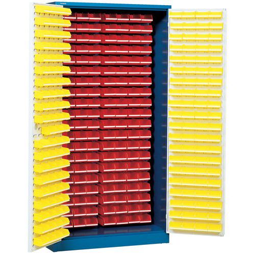 - Metalskab til opbevaring på arbejdspladsen og på lageret. Skabet erlakeret med slidstærk pulverlak. Let at indstille takket være indstillingsfødderne. Komplet med 160 bakker a 1 l (75 x 105 x 175 mm) og 160 bakker a 0,4 l (55 x 105 x 90 mm). Med cylinderlås. Plads til etiketter og tekst på samtlige bakker som visualiserer og forenkler opbevaringen af småting.
