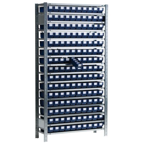 - Forzinket bakkeskab med 16 hylder og Arca lagerkasser 1,5-5,3 l, 45-serien i polypropen. Lagerkasserne har stopkanter for at holde boksen på plads ved plukning. Bakkerne leveres uden mellemvægge og etiketter.