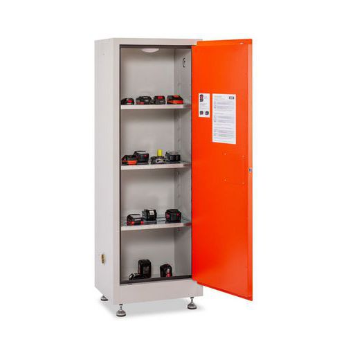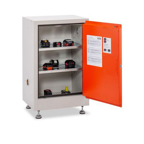 Stålskab med dobbelte vægge, der beskytter nye litiumbatterier, for eksempel fra elektriske værktøjer eller haveudstyr.