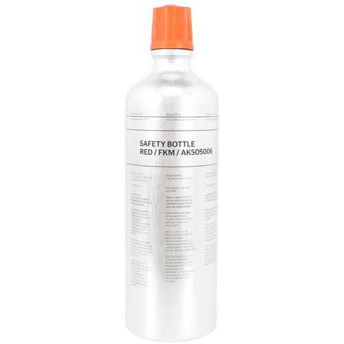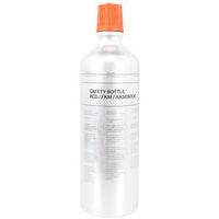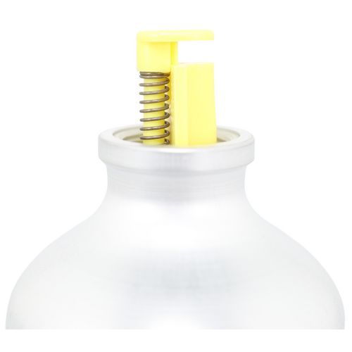 Sikkerhedsflaske med klap, der kun åbnes ved tryk med en finger.