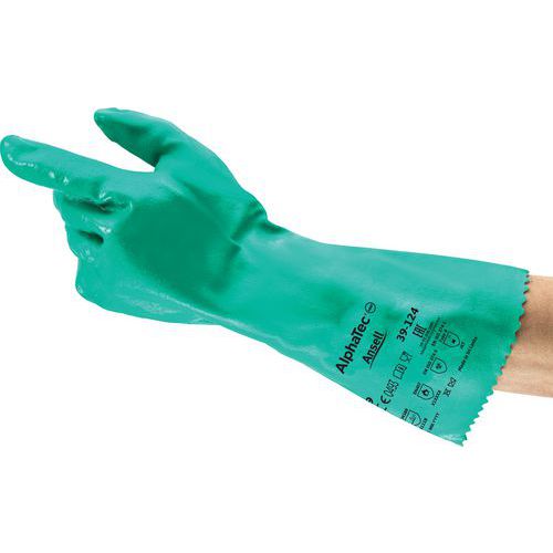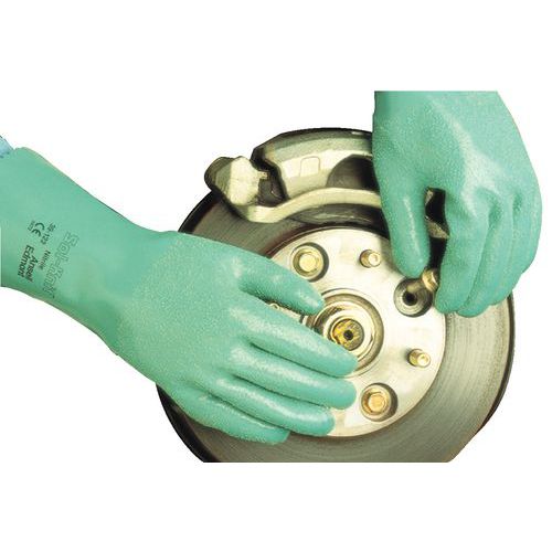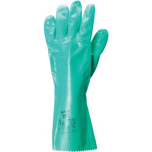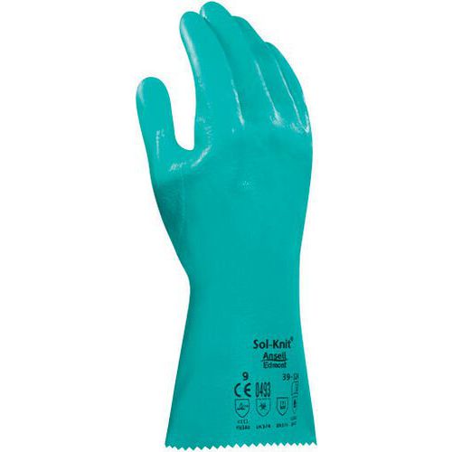 | Varenavn | Beskyttelseshandske Sol-Knit, Materiale: Nitril, Farve: Grøn, Handskestørrelse: 9, Foring, materiale: Bomuld |