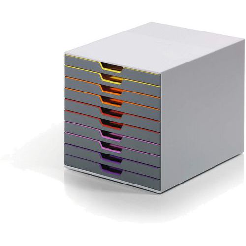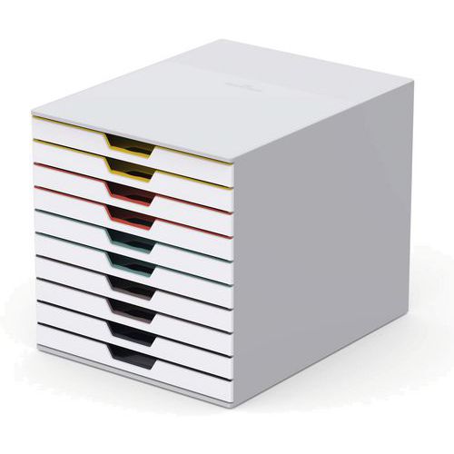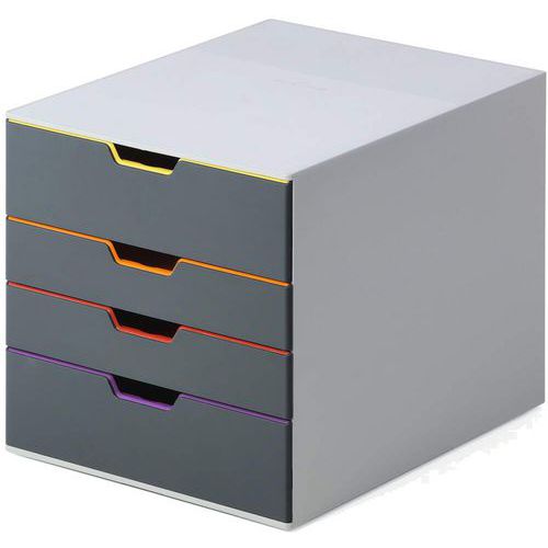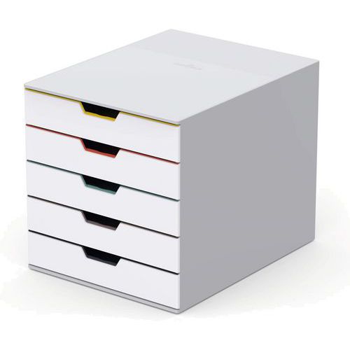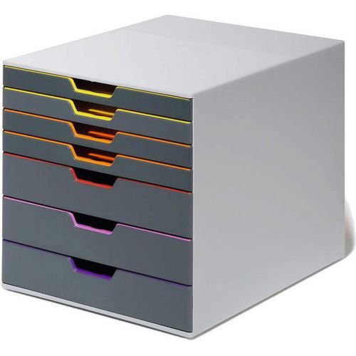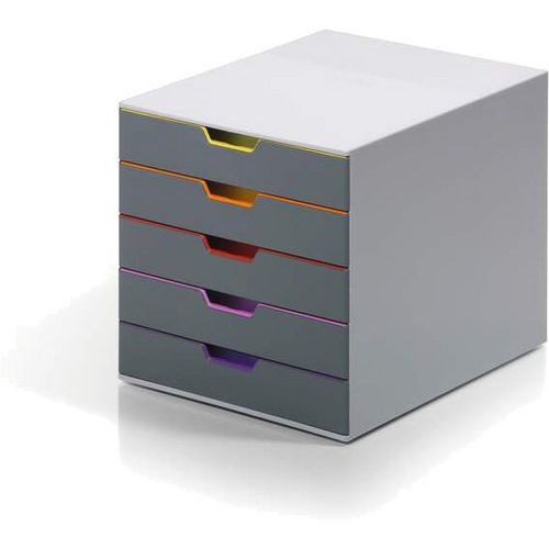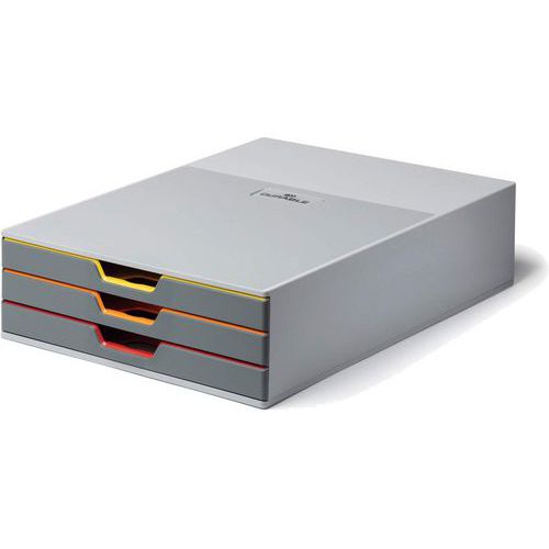 Opbevaringsboks, blanketboks, arkivboks, skuffesystem - uanset hvad man kalder den, er VARICOLOR en klassisk allroundboks i moderne design til opbevaring og organisering af dokumenter og kontorartikler. VARICOLOR-serien er ideel til kontorer, hjemmekontorer, skoler og kreative arbejdsmiljøer, hvor både æstetik og praktisk opbevaring er vigtigt. Opbevaringsboksen er fremstillet af højkvalitets ABS- og PS-plast. Boksen har letglidende og støjsvage farverige skuffer med udtræksstop. Til dokumenter i format op til A4-, C4-, folio- og letter-size-format. Skufferne er udstyret med transparente etiketvinduer og udskiftelige etiketter. Blanketboksen er stabelbar og har skridsikre plastfødder. Kan placeres i kontorskabe og -sideborde i standardstørrelse. Blanketboks VARICOLOR leveres med 5 års garanti.