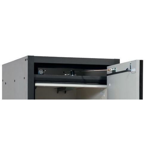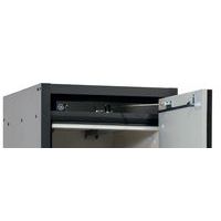 Sikkerhedsopbevaringsskab Q-CLASSIC-30. Sikker og godkendt opbevaring af brandfarlige stoffer i arbejdsmiljøer. Funktionskonstruktion: Robust konstruktion og lang levetid: dør med tre hængsler, skabsramme af melaminharpiks og flammesikre specialplader, sikkerhedselementer monteret udenfor opbevaringsrummet for øget beskyttelse mod korrosion, døre med metalfront og ridse- og slag - modstandsdygtig overflade, nem at rengøre. Enkel og bekvem håndtering: Dørene forbliver i enhver position, selvlukkende i tilfælde af brand. Ingen uautoriseret brug: Låsbare døre med profilcylinder (integration i eksisterende låsesystem mulig). Nem transport: integreret transportbund med aftageligt bunddæksel som ekstraudstyr, eller justeringshjælp med bundplade. Ventilation: integrerede luftkanaler klar til tilslutning (DN 75) til et teknisk udsugningssystem.