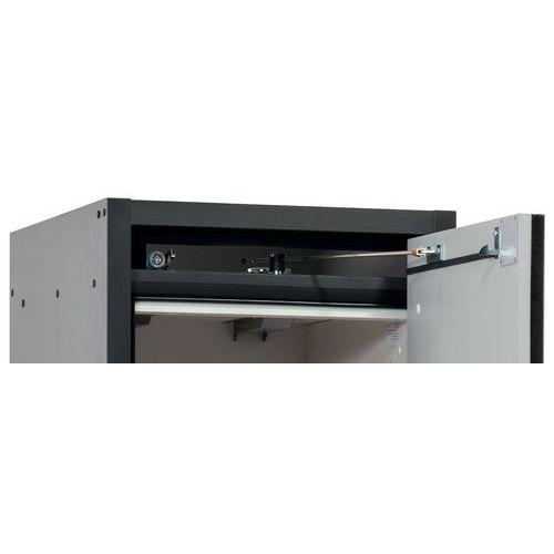 Sikkerhedsopbevaringsskab Q-CLASSIC-30. Sikker og godkendt opbevaring af brandfarlige stoffer i arbejdsmiljøer. Funktionskonstruktion: Robust konstruktion og lang levetid: dør med tre hængsler, skabsramme af melaminharpiks og flammesikre specialplader, sikkerhedselementer monteret udenfor opbevaringsrummet for øget beskyttelse mod korrosion, døre med metalfront og ridse- og slag - modstandsdygtig overflade, nem at rengøre. Enkel og bekvem håndtering: Dørene forbliver i enhver position, selvlukkende i tilfælde af brand. Ingen uautoriseret brug: Låsbare døre med profilcylinder (integration i eksisterende låsesystem mulig). Nem transport: integreret transportbund med aftageligt bunddæksel som ekstraudstyr, eller justeringshjælp med bundplade. Ventilation: integrerede luftkanaler klar til tilslutning (DN 75) til et teknisk udsugningssystem.