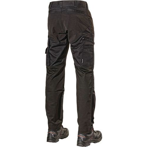 Stretchstof over bagende, front, skridt samt på knæets for- og bagside for ekstremt god bevægelighed, komfort og luftighed. Ved hjælp af stretch og en smallere pasform skabes en mere kropsnær buks. Forbøjede knæ for bedre pasform og fleksibilitet. Kan lægges 5 cm ned. Materialer og gramvægt: 65 % polyester, 35 % bomuld. 245 g/m². To forlommer. Indfældede stolpelommer bagpå. Højre ben med knivholder og tommestoklomme med blyantlommer. Benlomme med lynlås og indvendig telefonlomme og udvendig vinklet telefonlomme forsynet med magnetlås.