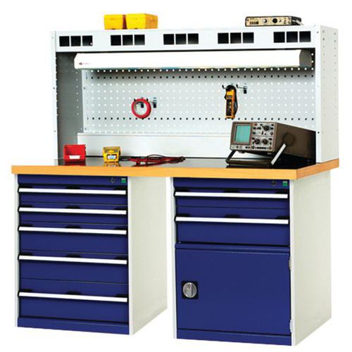 | Varenavn | Cubio Combi arbejdsbord med 2 skabe med skuffer, Totalhøjde: 840 mm, Totalbredde: 2000 mm |