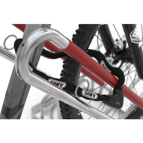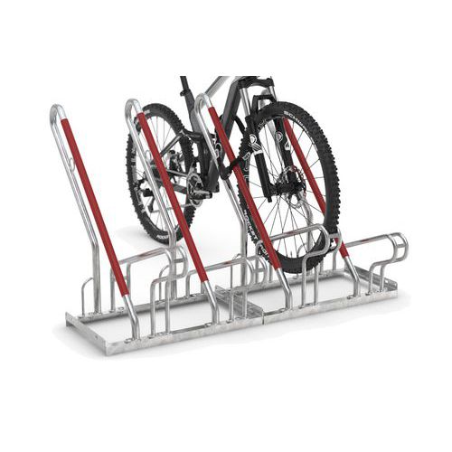 Den slående detalje ved dette fritstående cykelparkeringssystem er den diagonale stelstøtte, der er beklædt med signalrød plast, som beskytter cykler mod utilsigtet brud på hjulene og følgeskader på fælgene.