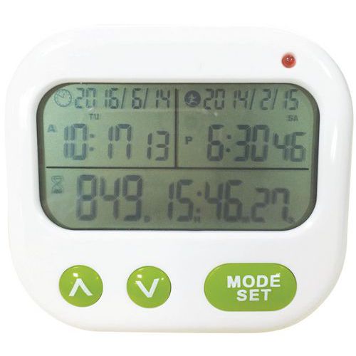 - Nedtællingstimer, der kan indstilles til 1999 dage, 23 h, 59 min, 99 min og 59 sek. LCD-display, der viser klokken, urskiven og nedtællingstimere. Let at bruge, tryk på knapperne foran. Ur med time-, minut-, sekund- og ugevisning. Kalender omfatter 100 år frem. Alarmen kan indstilles ved hjælp af LED-computerindikatorer, der omfatter alarmen og nedtællingen.