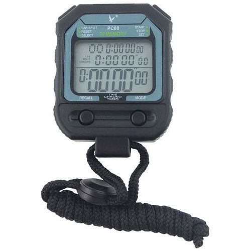 - 1/100 sekunds nøjagtighed op til 10 h. 10 hukommelser SPLIT/LAP. Læsning af mellemtider (split), af omgange (lap). Display med 3 rækker. Flere funktioner: omgangstæller, distanceanordning, tidsstatistik, nedtællingstimer.