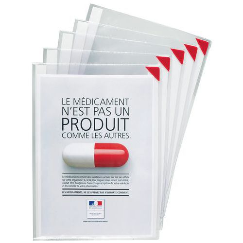 Ideel til visning af dokumenter på glasvægge og i udstillingsskabe (gennemsigtig på begge sider). Bevarer overflader: intet behov for tape, stifter eller hæfteklammer, så derfor ingen huller. Forbedrer jeres virksomheds image: dokumenterne præsenteres flot. Magnetisk hjørnelukning. 2 klæbebånd på bagsiden. Til brug i stående eller liggende tilstand. Kan rumme op til 10 ark 80 g papir.