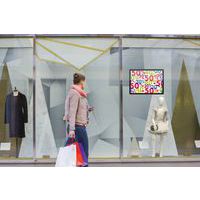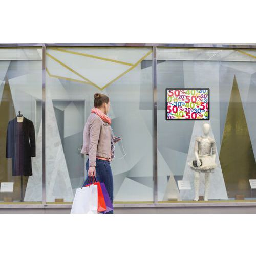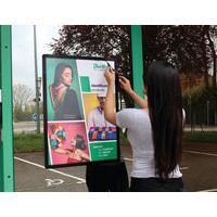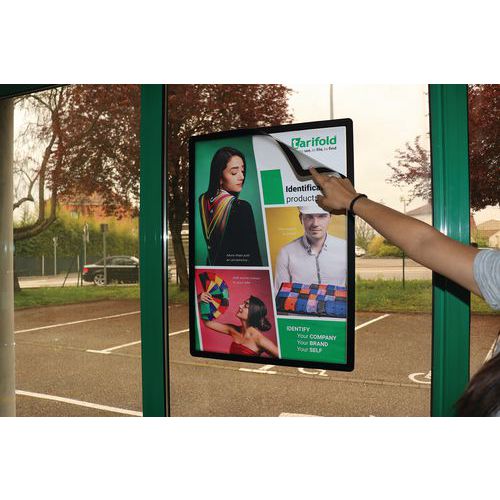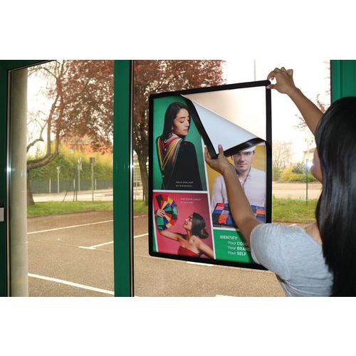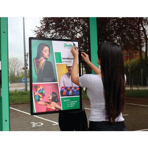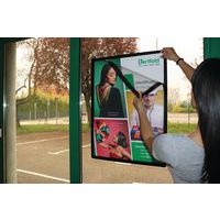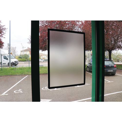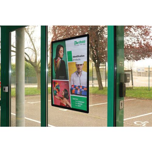 Dobbeltsidet plakat på glasskærm takket være dobbeltsidet ramme.