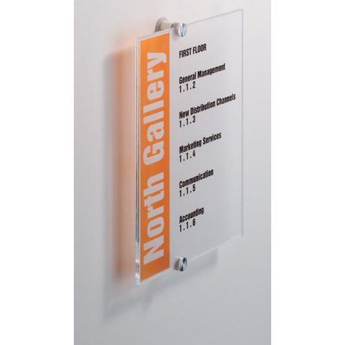 - Stilrent skilt i akrylplast, som holdes sammen med to dekorative skruer.