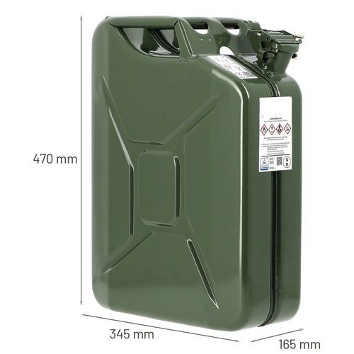 | Varenavn | Dunk af stålplade, Volumen: 20 L, Farve: Grøn, Type: Benzin, Længde: 345 mm, Bredde: 165 mm, Højde: 470 mm |