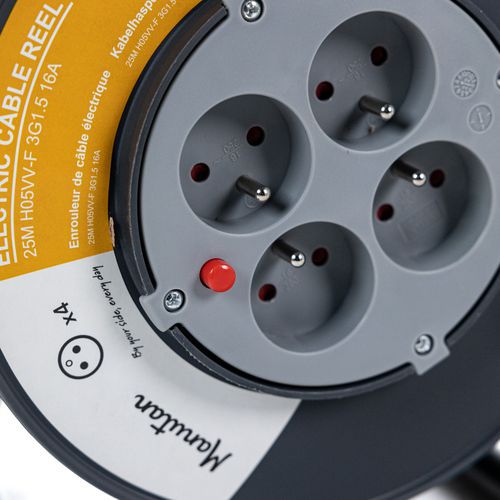 Manutan elektrisk kabelrulle med dæksler..Udstyret med 4 x 2P + E 16 A/23 V udtag..Tromlevinde med en termisk afbryder for at beskytte mod overophedning..Leveres med børnesikkerhedsdæksler..Praktisk til transport takket være det ergonomiske håndtag..Alle Manutan-produkter er testet og godkendt af vores teams.