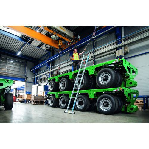 Enkeltstige SaferStep L med eloxerede aluminiumstrinsider for skridsikker komfort, der ikke sviner dine hænder til. Strækpressede aluminiumstrin med integreret Safer Step-teknologi for skridsikkerhed giver behagelig og sikker opstigning. Forbindelse trinpinde-trinside gennem stabil kvalitetsflange fra Zarges. Udskiftelige glidesikringer af to-komponent gummi blandning for skridsikker stabilitet. I overensstemmelse med standarden EN 131 1+2 professionel.