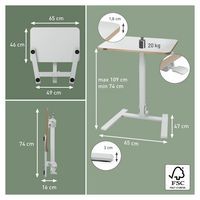 - Den 65 x 46 x 1,8 cm store bordplade rummer laptop med stativ, tastatur og mus og klarer en maksbelastning på 20 kg.