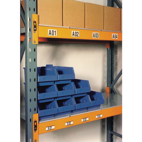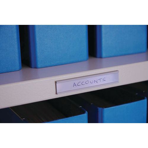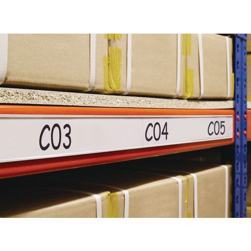 - Etiketholder i hvid plast. Hurtigt og let at ændre, udskifte, dreje eller vende etiketten. Etiketterne er beskyttet af gennemsigtigt PVC-film. Selvklæbende, der er ikke behov for klistret lim.