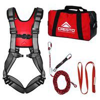 - Sættet indeholder en Cresto 1123 Worker Pro-helsele, en 15 meter justerbar faldsikringsline samt en forankringsslynge, alt samlet i en praktisk og let transporterbar taske.