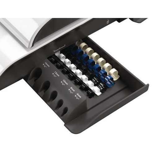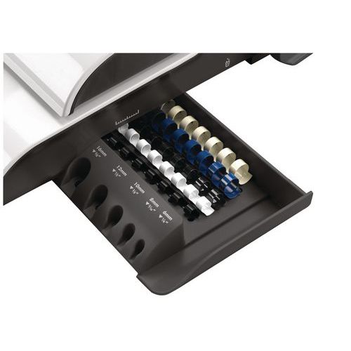 Nem indbinding med de skrå ringstøttetænder Justerbart kantstyr til præcis justering af alle dine dokumenter Opbevaringsskuffe med fremfører for indbindinger og dokumenter Spånskuffe åbner automatisk for at forhindre tilstopning Indbindingskapacitet på 300 sider med ryg med en maks. dimension på 38 mm. Stanser og indbinder