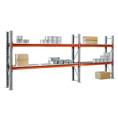 Reolen består kun af to dele, gavle og bærebjælker. Hvis reolen suppleres med hylder, kan du opbevare skuffe og papkasser. Reolen kan også anvendes til opbevaring af paller, både hel- og halvpaller. Pallerne kan også stilles direkte på hylderne. Udformet i henhold til EAB-standarden med galvaniserede gavle og trin samt orange bærebjælke.