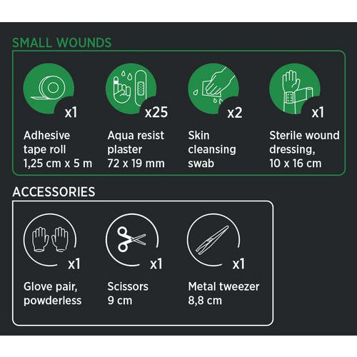 - Indeholder 32 dele bl.a. plastre, renseservietter, saks, pincet og handsker.