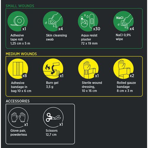 | Varenavn | Førstehjælpskasse, Standard, Farve: Sort, Bredde: 175 mm, Længder: 190 mm, Dybde: 70 mm |