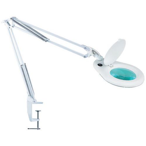 - Rund luplampe med sammenklappeligt låg, der giver udvidet beskyttelse. Lavt forbrug. LED-lamper med lang varighed. Leddelt arm med manuel justering. Luplampen fastgøres ved hjælp af en gribetang.