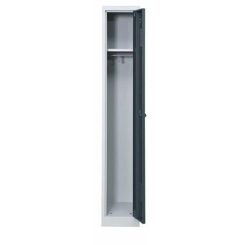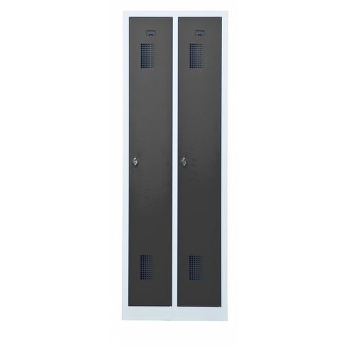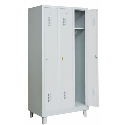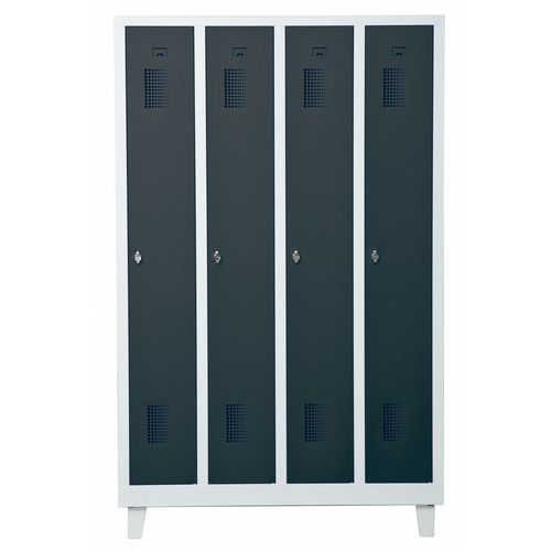 Garderobeskab med en, to, tre eller fire døre. Låsning med hængelås. Overfladen er pulverlakeret med en slidstærk strukturlak, der beskytter mod slitage. Skabet er designet med en sokkelkant i bunden, hvilket gør det fleksibelt at placere direkte på gulvet, på benstativ eller kombineret med en siddebænk. Perfekt alternativ til både omklædningsrum og gangareal.