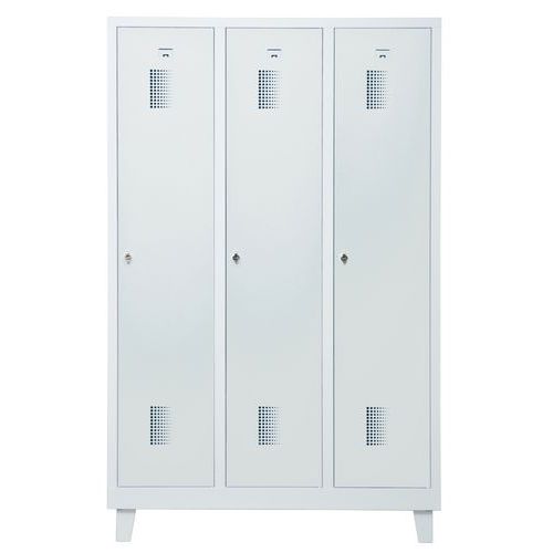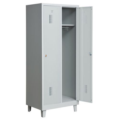 Garderobeskab med en, to, tre eller fire døre. Låsning med hængelås. Overfladen er pulverlakeret med en slidstærk strukturlak, der beskytter mod slitage. Skabet er designet med en sokkelkant i bunden, hvilket gør det fleksibelt at placere direkte på gulvet, på benstativ eller kombineret med en siddebænk. Perfekt alternativ til både omklædningsrum og gangareal.