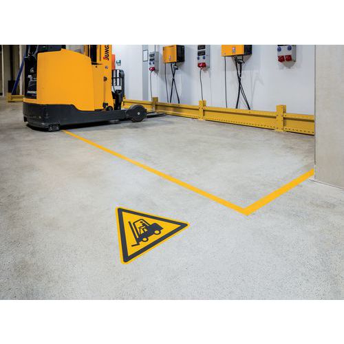 Selvklæbende, ekstra stærk mærkningstape til indendørs brug. Bruges til permanent mærkning af områder, der skal gøres opmærksom på, f.eks. områder med trafik og afspærrede områder. Klæbes på rene og tørre betongulve. Slidstærk og holdbar med skridsikringsklasse R10 i overensstemmelse med DIN 51130. Affasede kanter. Tåler trafik fra gaffeltrucks og løftevogne. Undtaget er dog når drejes, bremses og laves rotations bevægelser direkte på markeringstapen. Fremstillet i Storbritannien