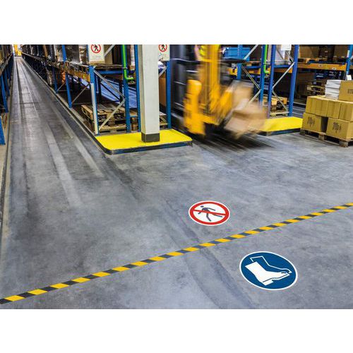 Selvklæbende stribet mærkningstape til indendørs brug. Bruges til permanent mærkning af risikoområder, der skal gøres opmærksom på, f.eks. områder med trafik og afspærrede områder. Klæbes på rene og tørre betongulve. Skridsikringsklasse R9 i overensstemmelse med DIN 51130. Tåler trafik fra gaffeltrucks og løftevogne. Undtaget er dog når drejes, bremses og laves rotations bevægelser direkte på markeringstapen.