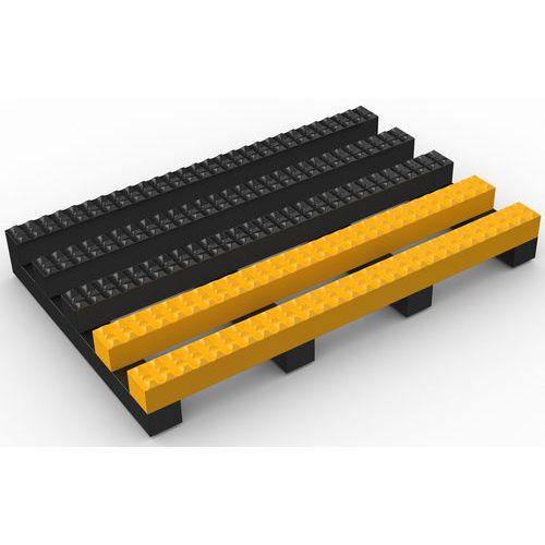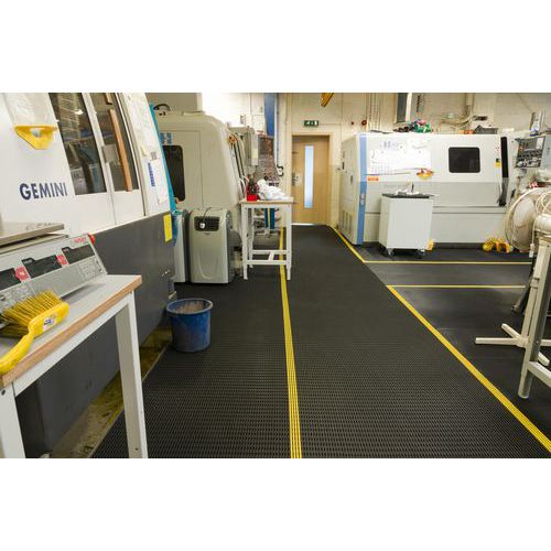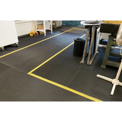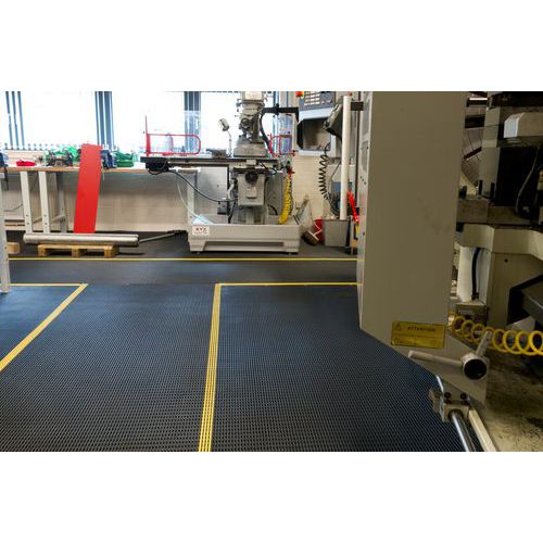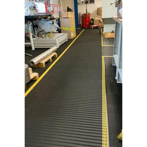 Øger produktiviteten. Mindsker træthed. Det er muligt at bestille kantlister, der gør det lettere for vogne at passere, fastgøringsanordninger til gulv og fastgøringsclips til sammenføjning af gulvmåtter. 100 % genvundet PVC.