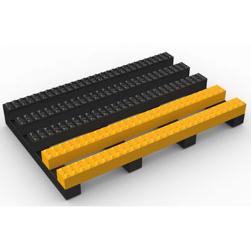 Øger produktiviteten. Mindsker træthed. Det er muligt at bestille kantlister, der gør det lettere for vogne at passere, fastgøringsanordninger til gulv og fastgøringsclips til sammenføjning af gulvmåtter. 100 % genvundet PVC.