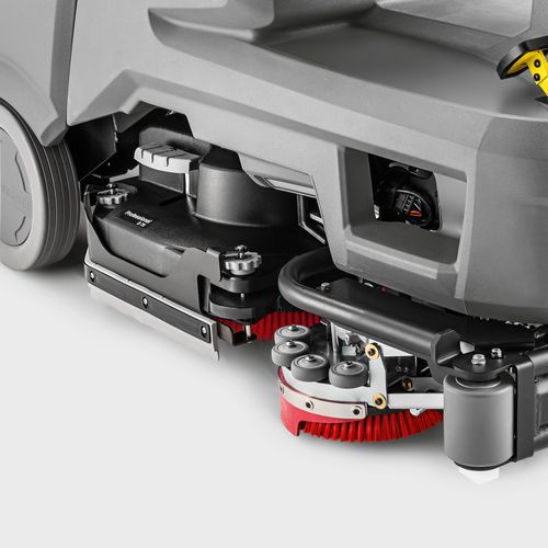 - Maskinen har et 75 cm skurehoved samt sideskuredæk, som muliggør rengøring tæt på kanter og under udhæng.