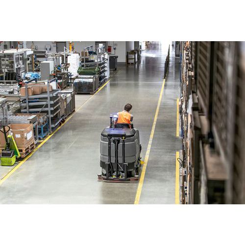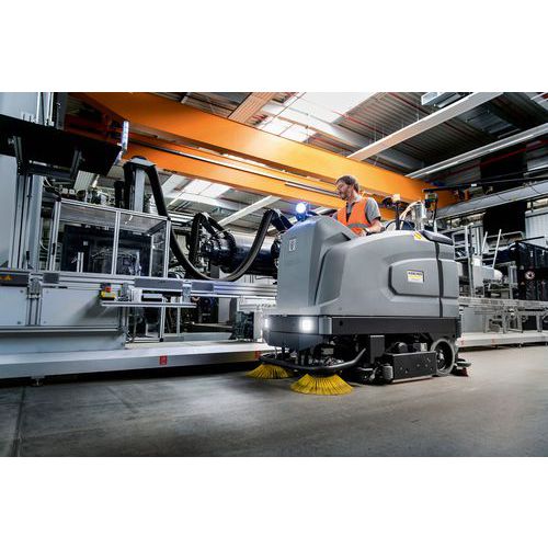- Maskinen har et børstevalsehoved med 100 cm arbejdsbredde og integreret feje funktion, som reducerer behovet for manuel forrengøring.