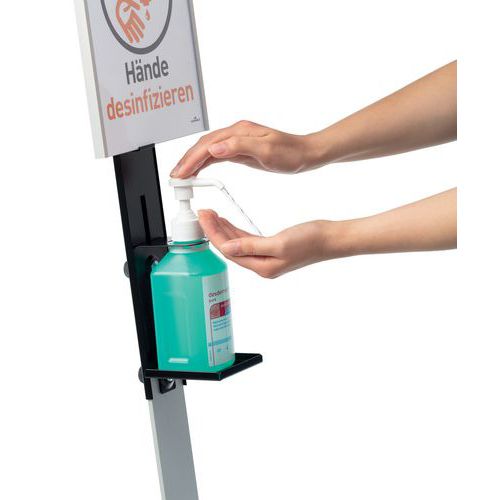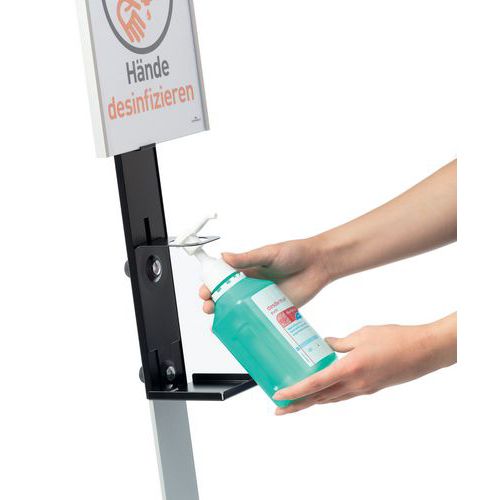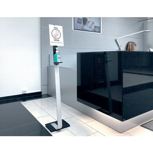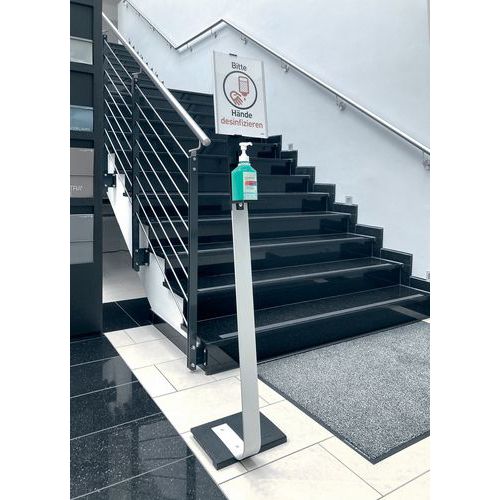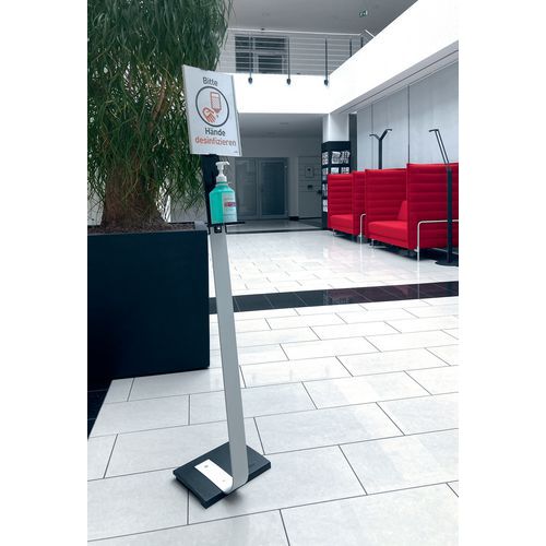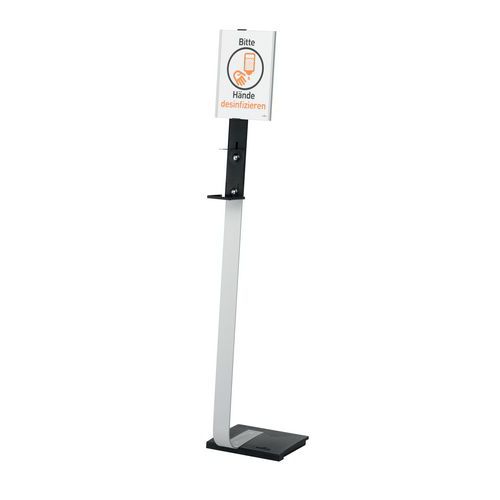 | Varenavn | Desinfektionsholder, gulvstativ med skilt, Farve: Hvid, Højde: 1464 mm, Bredde: 295 mm, Dybde: 275 mm |