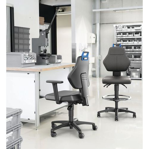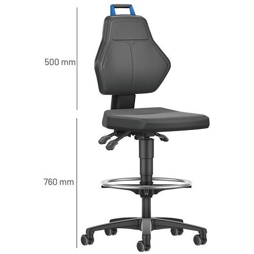 | Varenavn | Høj værkstedsstol på selvlåsende hjul , Armlæn: nej, Type af fod: Hjul, Sæde, materiale: Polyuretan |