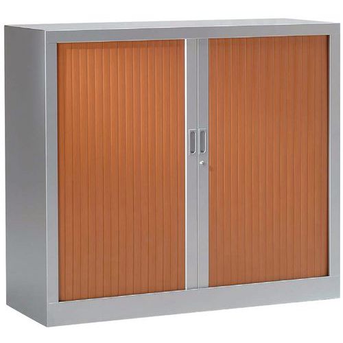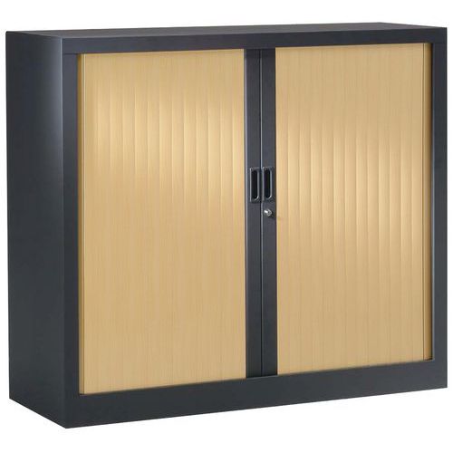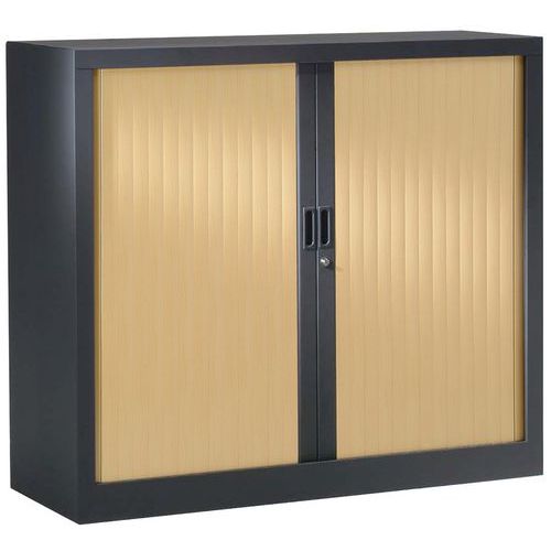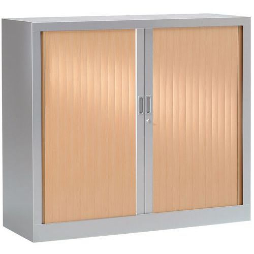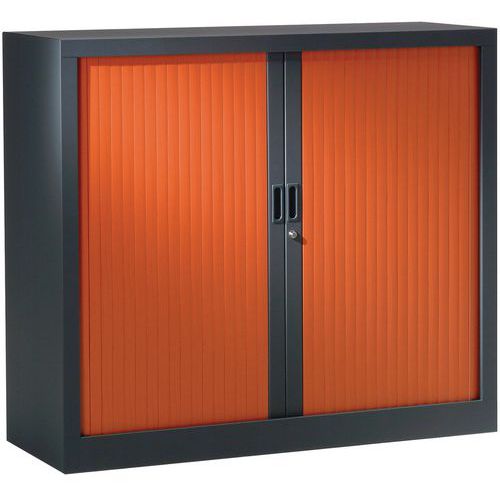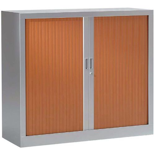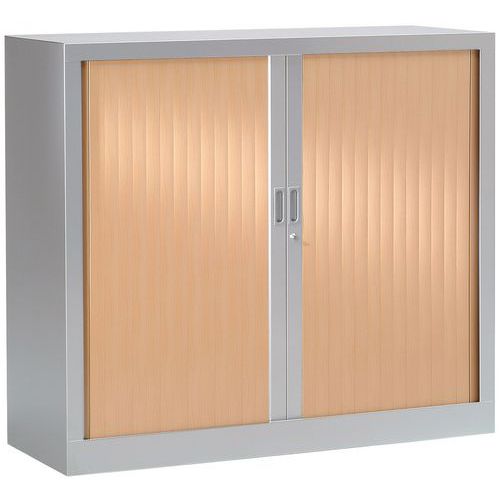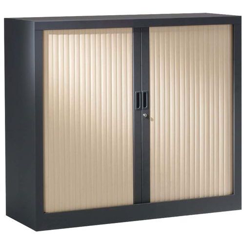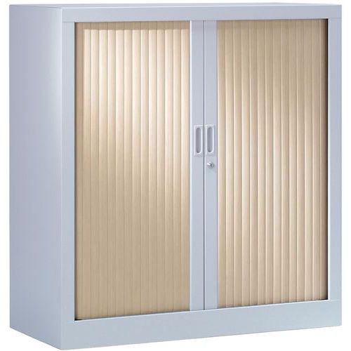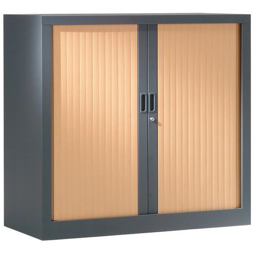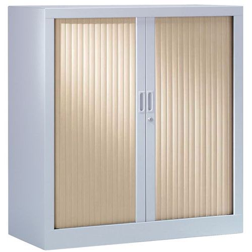 Skab med rullegardiner i ét stykke. Justerbare hylder beregnet til hængemapper. Flad bund og fire justeringscylindre. Lås med to nøgler med foldende ender. Fuldt åbne persienner og forsænkede håndtag. Vælg et funktionelt, stift og robust skab